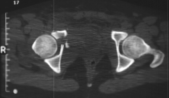 The patient is a 16 year old female that was previously in good health when she was involved in a roll-over motor vehicle accident as an unrestrained passenger, ejected from the vehicle. She landed in a field. She was taken by ambulance to a nearby hospital and later transferred to the A.I. duPont Institute for definitive treatment of a right acetabulum fracture, right pelvic fracture, and non-displaced left clavicle fracture. After evaluation with General Surgery for this multiple trauma victim, the patient's medical problems were isolated to the right hip and pelvis. She was hemodynamically stable with a benign abdomen. Although the pelvis grossly appeared stable, motion of the hip caused significant pain. The limb was intact neurologically and had strong pulses.