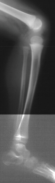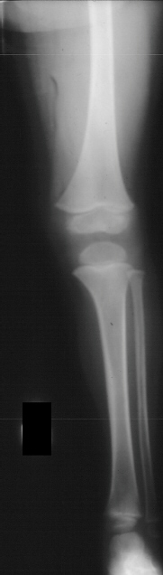 A 2 and 5/12 year old white male presented to clinic with a 2-3 month history of limping on the right lower extremity. There was no history of trauma to the extremity, or a history of constitutional symptoms such as fever, chills, sweats, malaise or weight loss. Prenatal, perinatal and postnatal course were all normal.. The child was achieving all developmental milestones within expected age ranges.