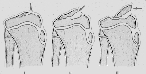 III fracture is fully displaced, usually with the knee held in a mildly