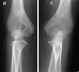 normal motion at the elbow with flexion from 0-135 degrees but