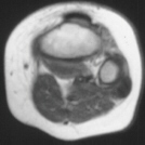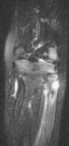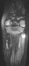 MRI examination of the left knee displayed a 2 cm. by 0.8 cm. lobulated