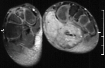 tumor at the planter aspect of the medial left foot which was infiltrative